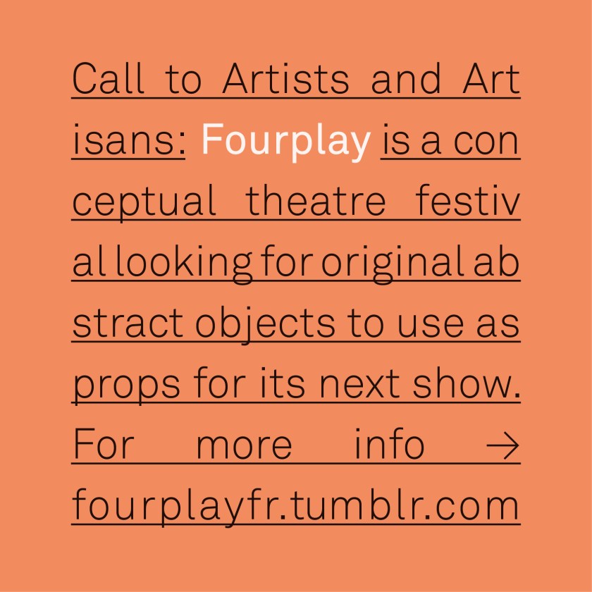 Alexandra Fadin is a dancer and artist. She creates figurative sculptures out of mixed media and incorporates them into improvised dance performances. For this edition of Fourplay, she loaned us one of her aluminium sculptures, whose limbs can be manipulated to assume different positions.