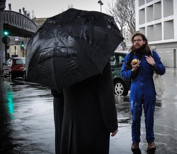 Ryan Galer, conceptual artist, proposed himself as a prop. For practical reasons we turned him down, so he then offered us every element of himself apart from his physical presence. To represent him on stage, he bestowed us his blue boiler suit, which he wears for most of his performances.
