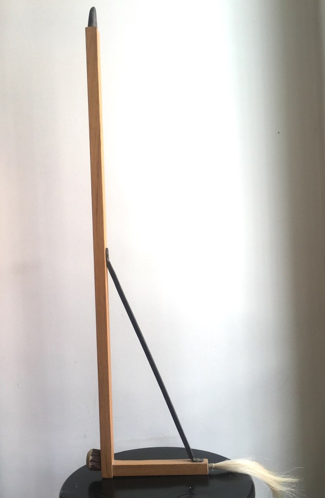 Mark Tallowin is an artisan working in a number of different materials. He began his hands-on career as a tree surgeon, before making knives and eventually leather goods. For this abstract object, he combined various found objects including rose wood, steel, horse hair, a reindeer antler and a black buffalo horn.